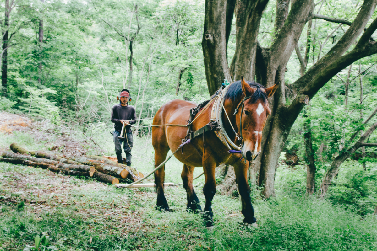 北海道ばんえい競馬の引退馬、ヤマトは信州の森で林業の馬として活躍しています。馬搬という馬を使った林業は、重機が通る為の林道整備が必要なく、無駄なエネルギー消費が少ない自然との共生型のシン林業です。